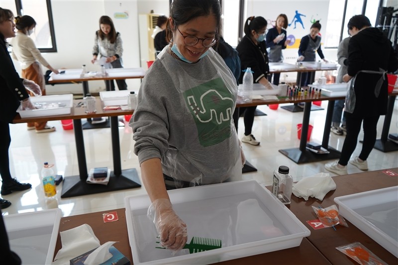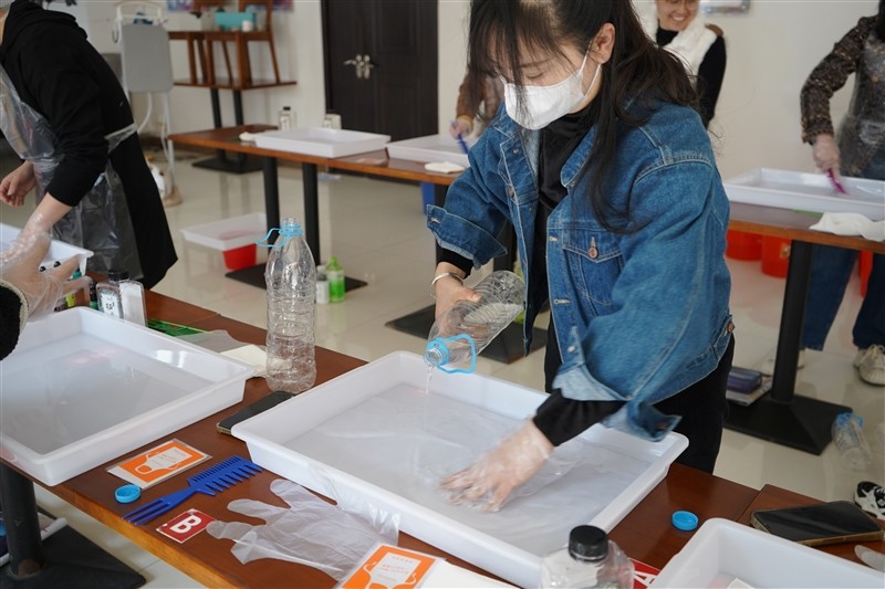 水拓技藝最早起源于中國,后經(jīng)絲綢之路傳至土耳其,并在當(dāng)?shù)卮蠓女惒?,被列為非物質(zhì)文化遺產(chǎn)?;顒娱_始前,工會主席仔細(xì)為大家講解了水拓絲巾的步驟要點,例如畫液的稀釋、顏色的搭配、暈染的手法等等。