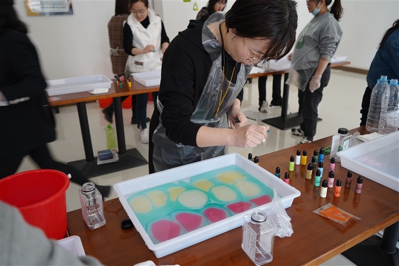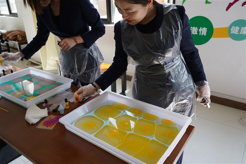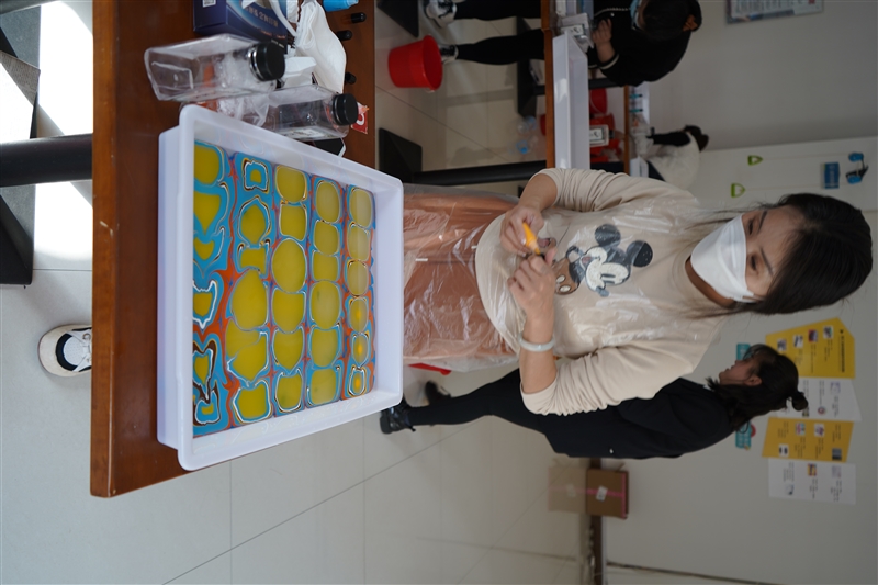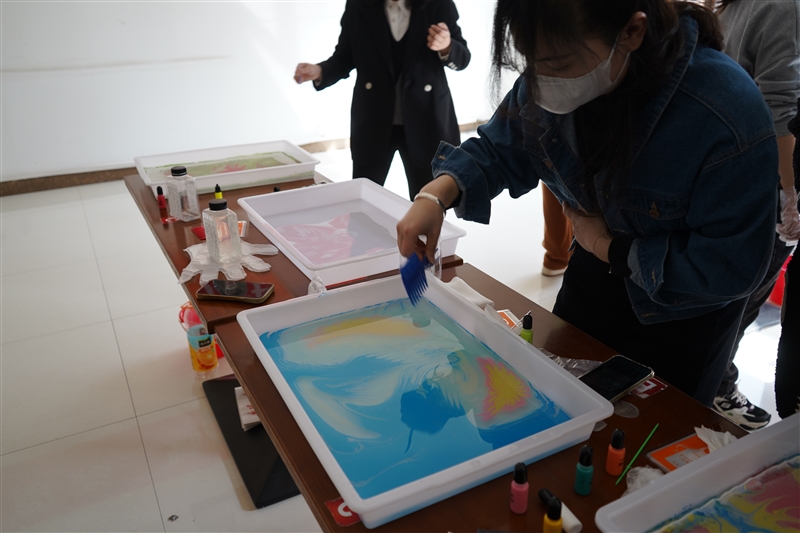 在這個花開如詩的季節(jié),大家通過現(xiàn)場講解及視頻教學(xué),發(fā)揮自己對色彩和畫面的想象,從固色、調(diào)色、創(chuàng)作、水拓到最后的晾干,既專注又認(rèn)真地體驗著制作水拓絲巾的全過程。體驗顏色與水的交融,慢慢滲開的驚喜,一滴、兩滴、三滴……或近或遠(yuǎn),顏色的碰撞、融合,帶給我們的意外和驚喜。